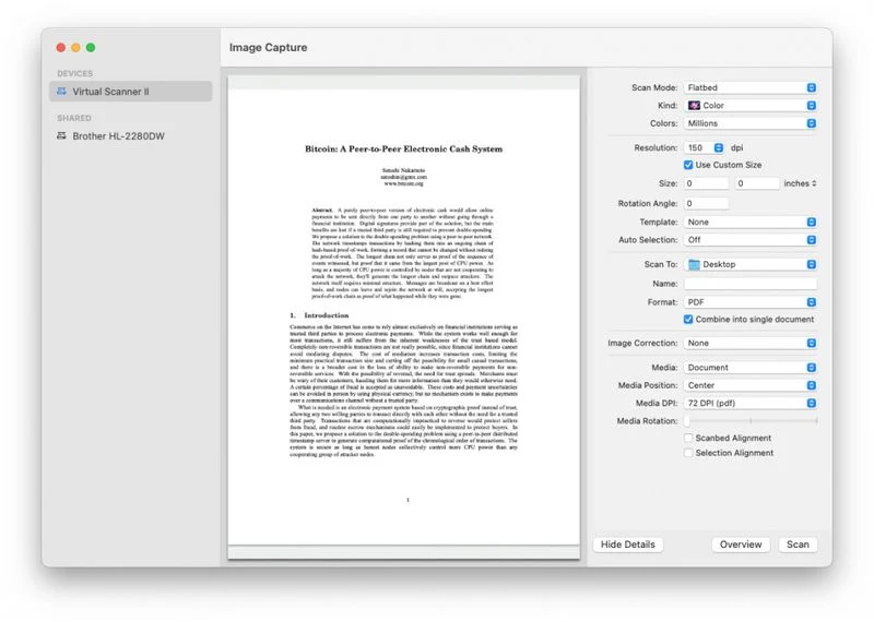 Baio는 macOS 이미지 캡처 유틸리티에서 비트코인 백서가 "가상 스캐너 II"라는 장치의 샘플 문서로 사용되는 것을 발견했는데, 이 장치는 Apple의 iPhone에서 가져오기 기능을 지원하거나 지원하지 않을 수 있으며, 기본적으로 모든 사용자에게 숨겨져 있거나 설치되지 않습니다.