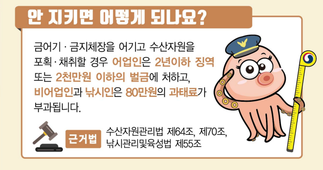 금어기ㆍ금지체장을 어기고 수산자원을 포획ㆍ채취할 경우 어업인은 2년 이하 징역 또는 2천만원 이하의 벌금에 처하고, 비어업인과 낚시인은 80만원의 과태료가 부과된다. - 근거법 : 수산자원관리법 제64조, 제70조, 낚시관리및육성법 제55조