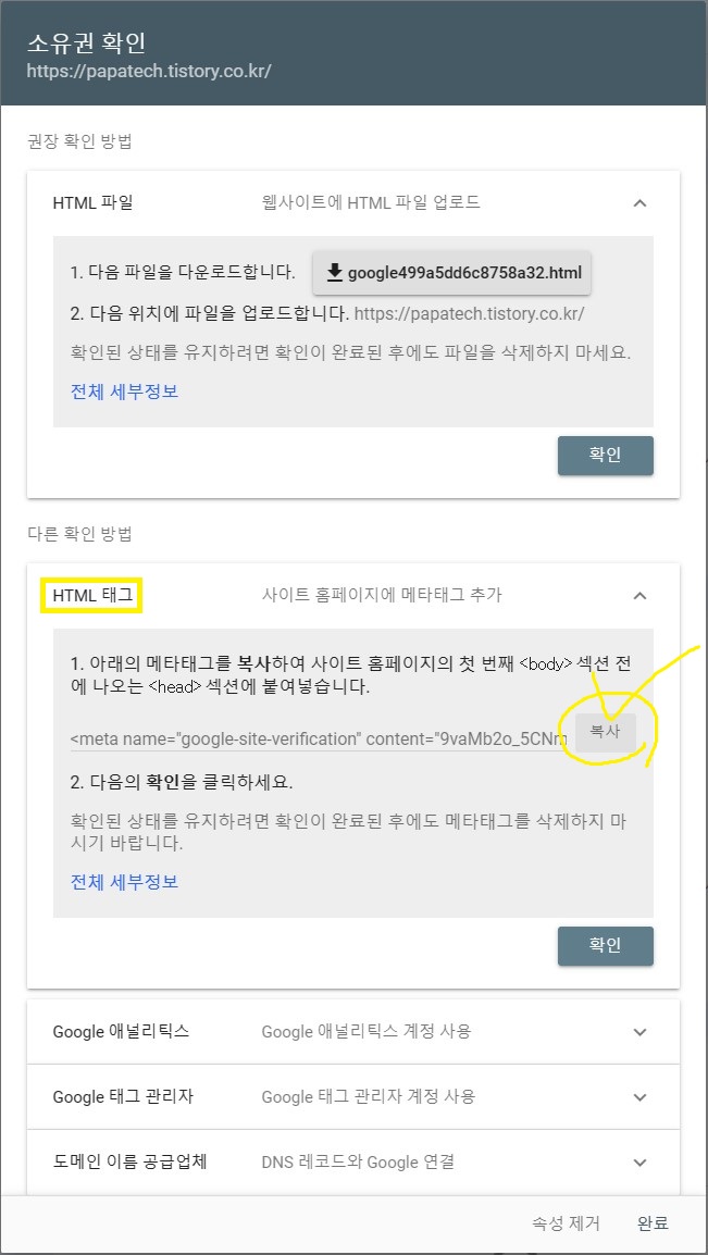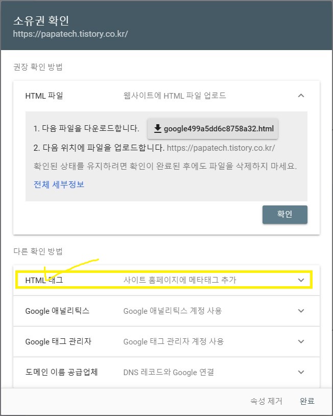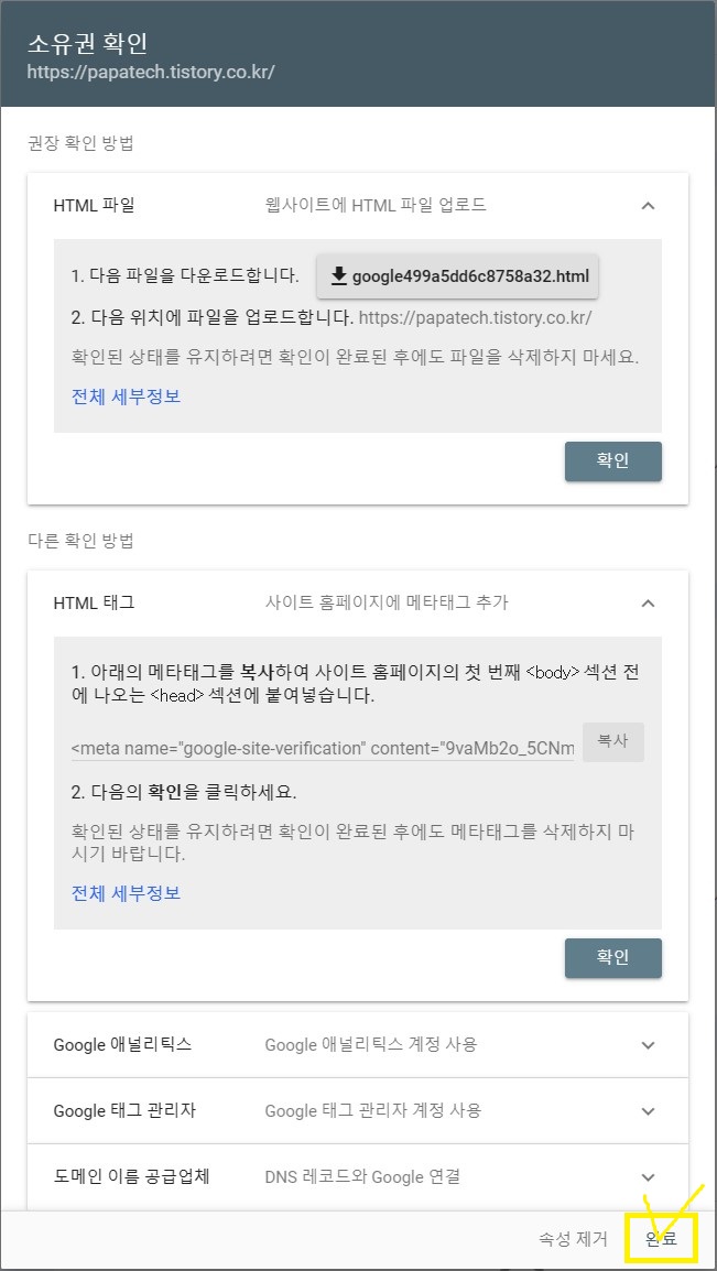 8. 다시 구글콘솔서치 소유권 확인 메뉴로 돌아와서 하단의 완료를 선택