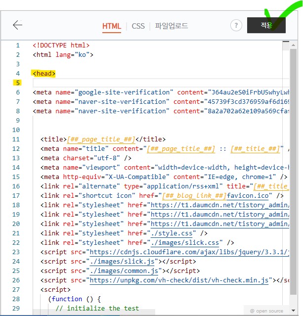 7. HTML 코드 중에 <HEAD>를 찾아서 그 아래 행에 복사된 Html 태그를 붙여 넣기(Ctrl+v) 후 적용을 누른다.