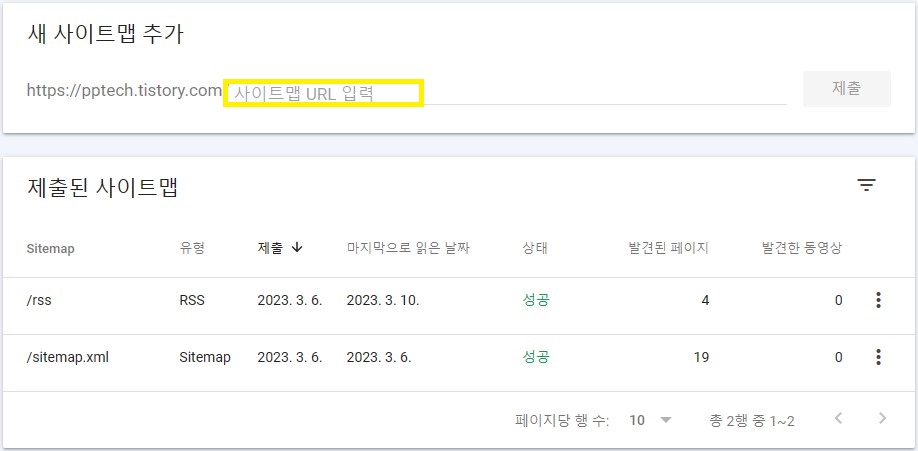 - 입력 2 : /sitemap.xml 입력 후 제출